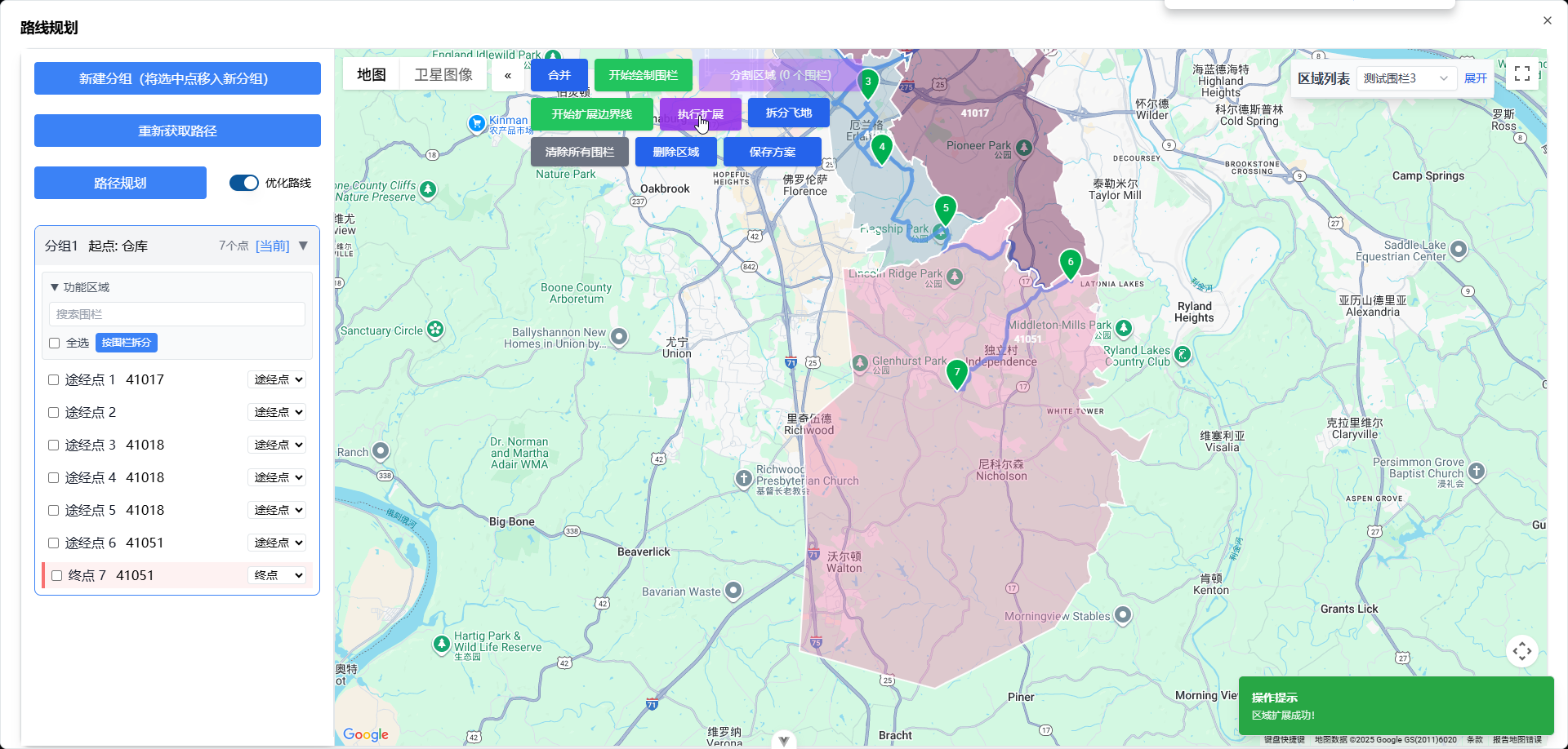 扩展围栏只支持一个区域进行扩展,但是有的邮编是有分地的,所以需要先进行拆分飞地,将飞地拆分成多个区域,然后再进行扩展。